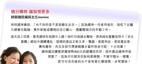 | * | 「自主賞購」只適用於網上換領方式。持卡人必須以最少2,500積分(以每件禮品計算)換購禮品,最多可以全數積分換領禮品;標準兌換率為每250積分(以未計算年資折扣的原本積分計算)相等於港幣1元,兌換現金必須以250積分為兌換單位。本換領申請須受匯豐信用卡的「獎賞天地」條款及細則約束。 |