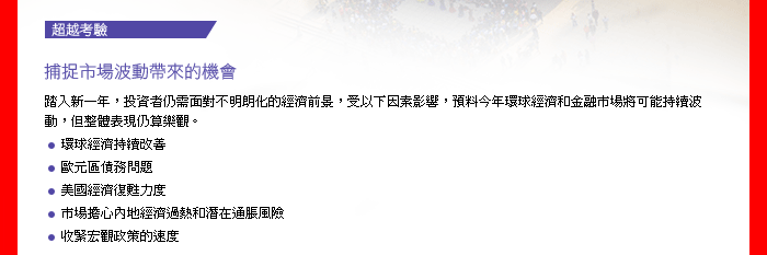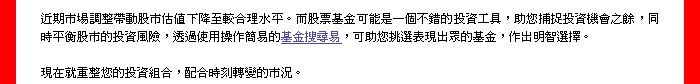 投資於某種市場之基金(例如新興市場、商品市場、小型企業等)可能會涉及較高風險, 並通常對價格變動較敏感。