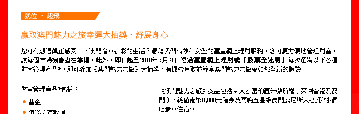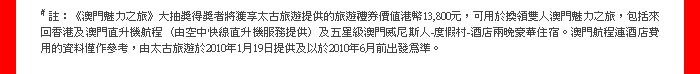 - 其中一位合資格客戶將被抽中並可獲享祟光禮券價值港幣8,000元及太古旅遊提供的旅遊禮券(「旅遊禮券」)價值港幣13,800元(請參閱以下太古旅遊之「旅遊禮券」需知), 可用於換領雙人澳門旅遊套票連香港至澳門來回空中快線直升機服務及兩晚住宿五星級澳門威尼斯人-渡假村-酒店。 旅遊套票連來回直升機服務費用及酒店住宿的資料僅作參考, 由太古旅遊於2010年1月19日提供及以2010年6月出發為準, 公眾假期除外。 澳門魅力之旅幸運抽獎將於5月中舉行並抽出一位得獎者。