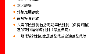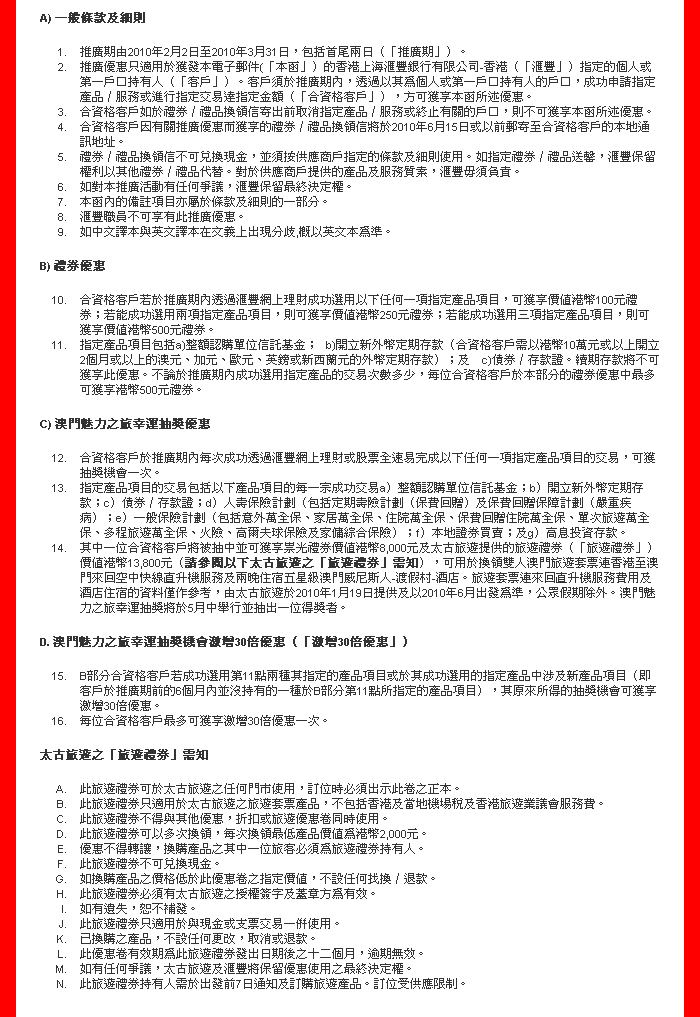 - 指定產品項目的交易包括以下產品項目的每一宗成功交易a)整額認購單位信託基金;b)開立新外幣定期存款;c)債券/存款證;d)人壽保險計劃(包括定期壽險計劃(保費回贈)及保費回贈保障計劃(嚴重疾病);e)一般保險計劃(包括意外萬全保、家居萬全保、住院萬全保、保費回贈住院萬全保、單次旅遊萬全保、多程旅遊萬全保、火險、高爾夫球保險及家傭綜合保險);f)本地證券買賣;及g)高息投資存款。