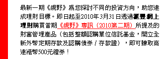 - 指定產品項目包括a)整額認購單位信託基金; b)開立新外幣定期存款(合資格客戶需以港幣10萬元或以上開立2個月或以上的澳元、加元、歐元、英鎊或新西蘭元的外幣定期存款);及 c)債券/存款證。 續期存款將不可獲享此優惠。 不論於推廣期內成功選用指定產品的交易次數多少, 每位合資格客戶於本部分的禮券優惠中最多可獲享港幣500元禮券。