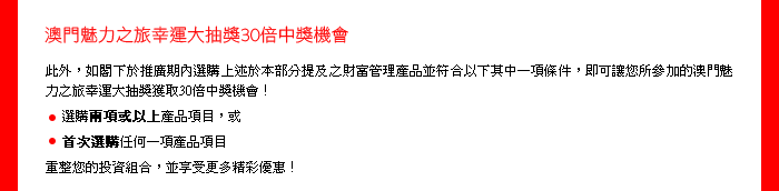 - B部分合資格客戶若成功選用第11點兩種其指定的產品項目或於其成功選用的指定產品中涉及新產品項目(即客戶於推廣期前的6個月內並沒持有的一種於B部分第11點所指定的產品項目), 其原來所得的抽獎機會可獲享激增30倍優惠。
