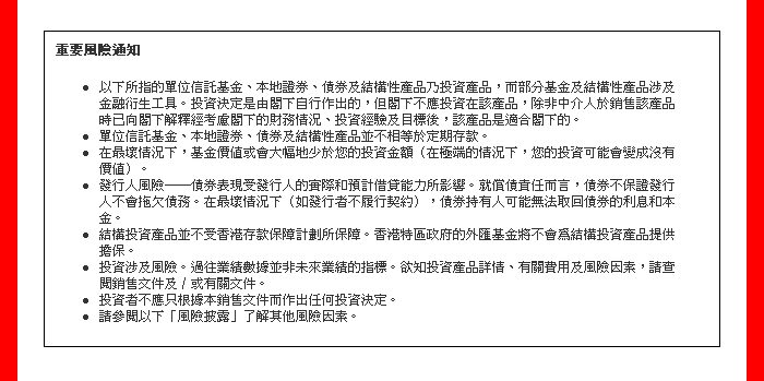 投資附帶風險, 投資價值可升可跌, 甚至變成毫無價值。 投資者應就本身的投資經驗、投資目標、財政資源及其他相關條件, 小心衡量自己是否適合參與任何投資項目。 請細閱有關投資產品的銷售文件, 以取得更詳盡資料包括風險因素。