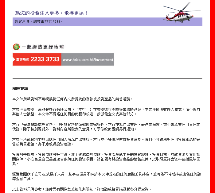 本文件由香港上海匯豐銀行有限公司(“本行”)在香港進行受規管業務時派發, 本文件僅供收件人閱覽, 而不應向其他人士派發。 本文件不得為任何目的而翻印或進一步派發全文或其他部分。