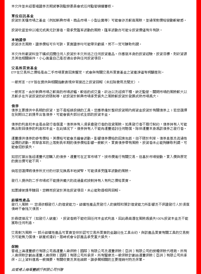 本文件所載資料並無因應任何個人情況作出檢核。 本行並不提供理財或投資意見。 資料不可視為對任何投資產品的銷售或購買邀請, 亦不應視為投資建議。