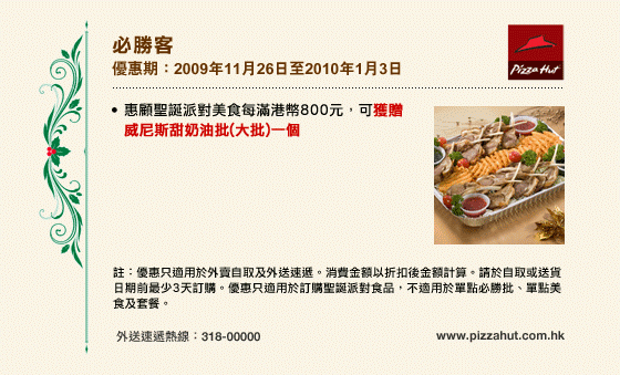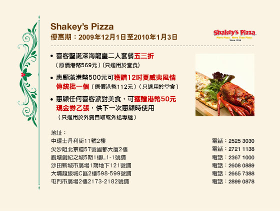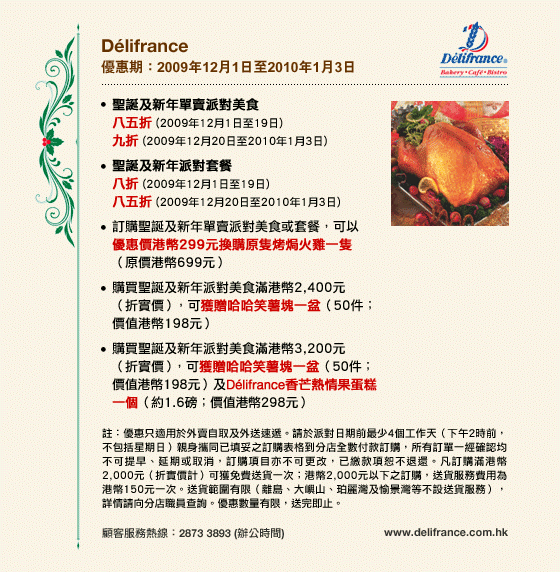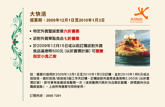 優惠不得轉讓,亦不可與任何其他折扣、推廣優惠、全年優惠、折扣產品/活動、八達通日日賞計劃、禮券、現金券、貴賓卡、貴賓積分計劃及會員優惠同時使用(除特別聲明外)。 |