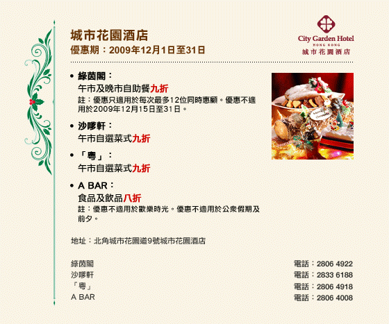 優惠只適用於堂食;另收加一服務費、茶芥及前菜(原價計算) (除特別聲明外)。 |