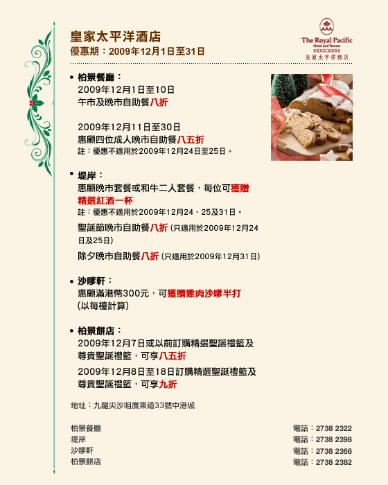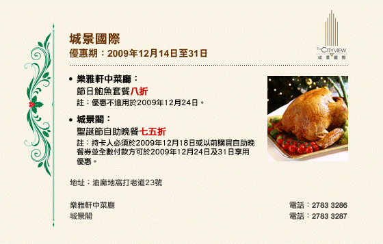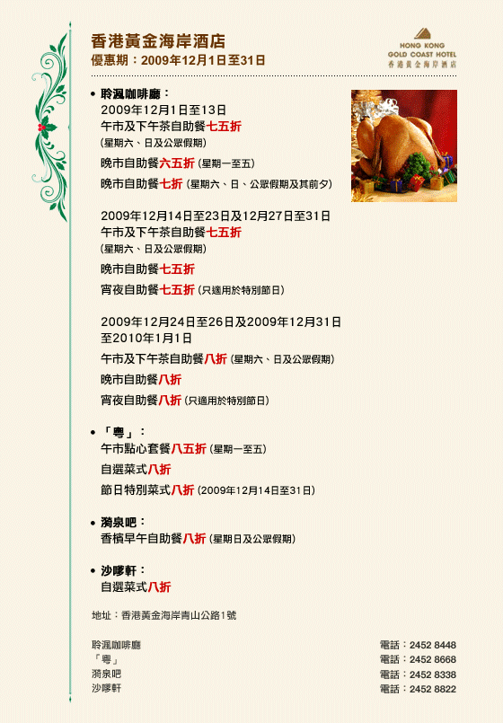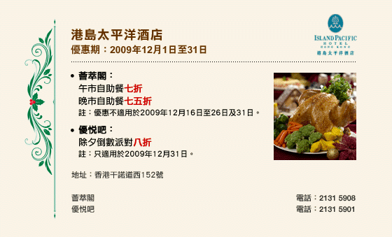 優惠不適用於加一服務費、外賣、減價/特價/定價菜式、特價套餐、筵席、房間送餐服務、婚宴、會議、廳房及私人廂房(除特別聲明外)。 |