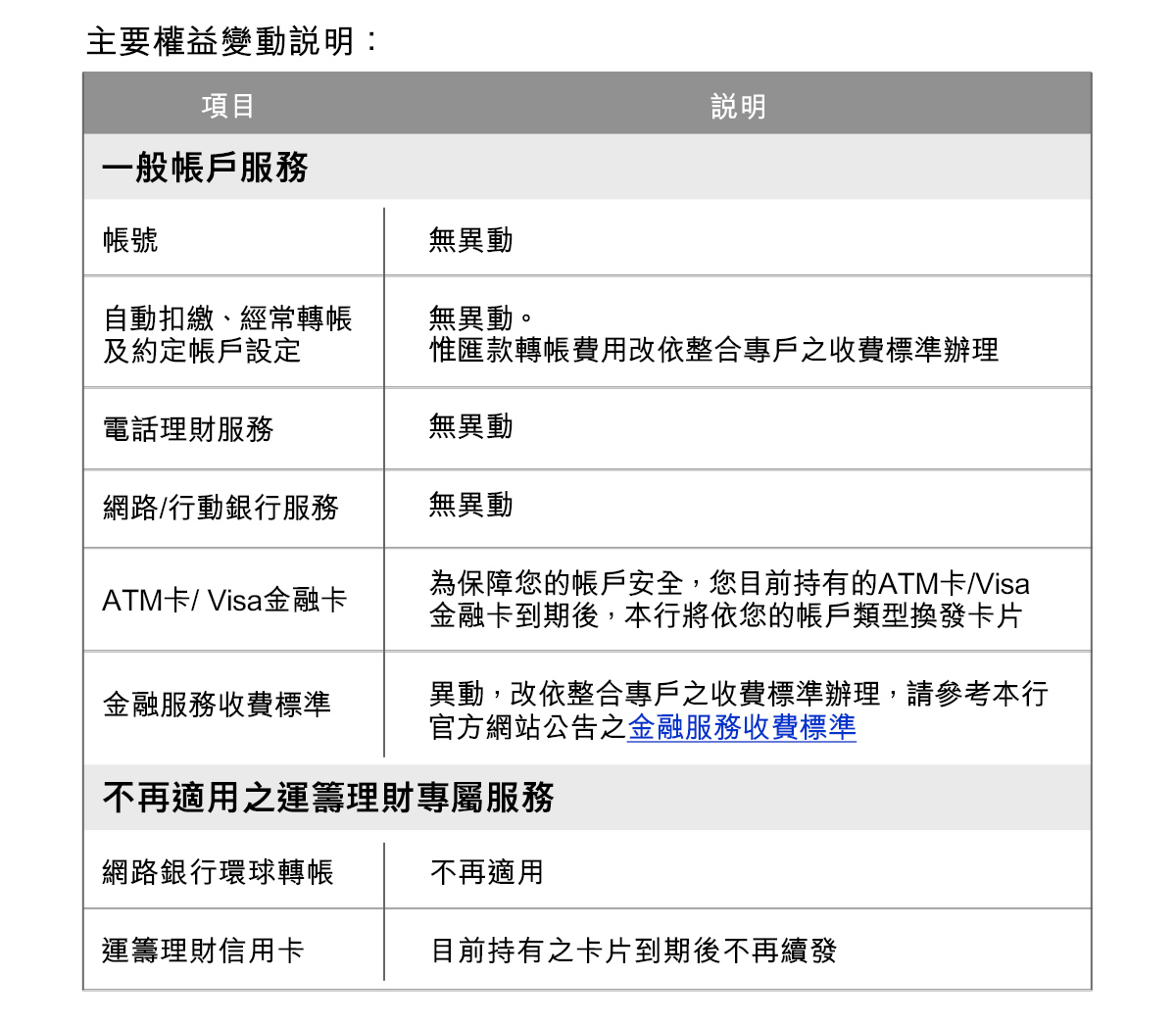 帳戶類型調整後,原運籌理財專戶的專屬權益將不再適用,您的帳戶將依據整合專戶的相關權益提供服務。若您希望繼續使用運籌理財專戶,請於上述日期前確認並維持帳戶每月最低平均餘額達到約定門檻,即可繼續享有運籌理財各項服務與優惠。