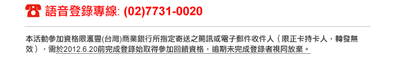 本行堅持嚴格的安全標準與程序以防止您的資料遭未經授權的存取。本行絕不會以電子郵件或其他方式要求您進行個人資料(如:使用者帳號、密碼或帳戶號碼)的確認。若您收到前述要求,請立即致電前述專線電話。